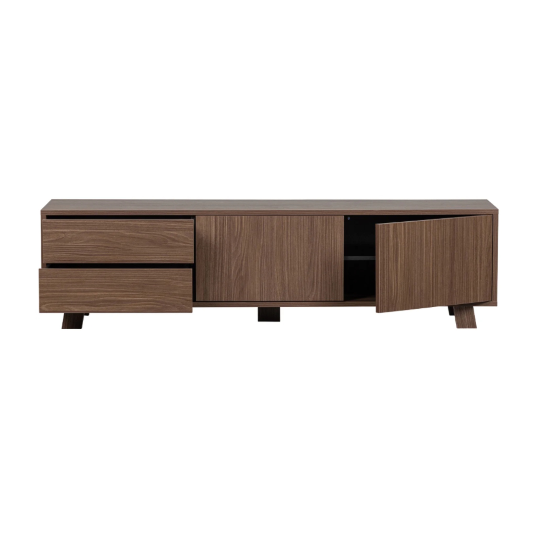 Comoda TV Rincol se remarcă prin designul său sobru și rafinat, inspirat din estetica nordică modernă. Realizată din lemn masiv cu furnir de nuc certificat FSC, fiecare piesă dezvăluie o textură distinctă, cu nuanțe calde și fibre vizibile care adaugă profunzime vizuală. Liniile curate, proporțiile echilibrate și picioarele ușor înclinate oferă un aer contemporan, dar atemporal.