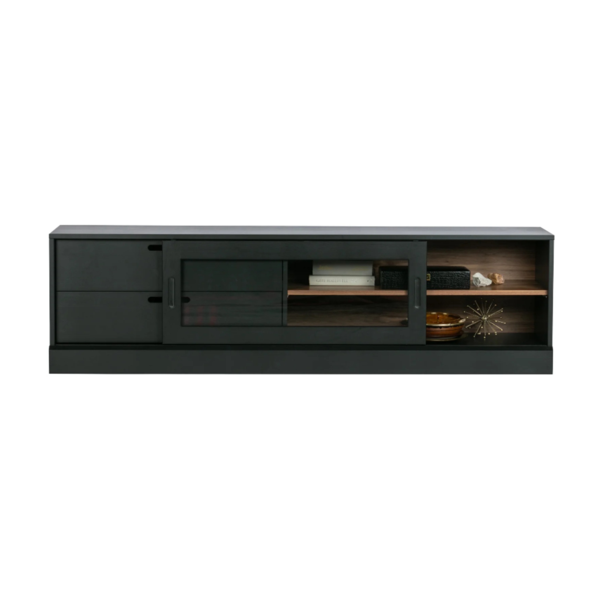 Comoda TV Tidoc aduce echilibru între simplitate și rafinament, fiind creată pentru interioare moderne cu accente minimaliste. Designul său sobru, în tonuri de negru mat și finisaj tip nuc, îi conferă o prezență elegantă și atemporală. Ușa glisantă din sticlă și sertarele spațioase oferă soluții practice pentru depozitarea echipamentelor media, cărților sau accesoriilor decorative. Textura naturală a lemnului de pin și structura solidă transformă această piesă într-un punct central în orice living contemporan, dar se potrivește la fel de bine și într-un birou modern sau o zonă de lounge rafinată.