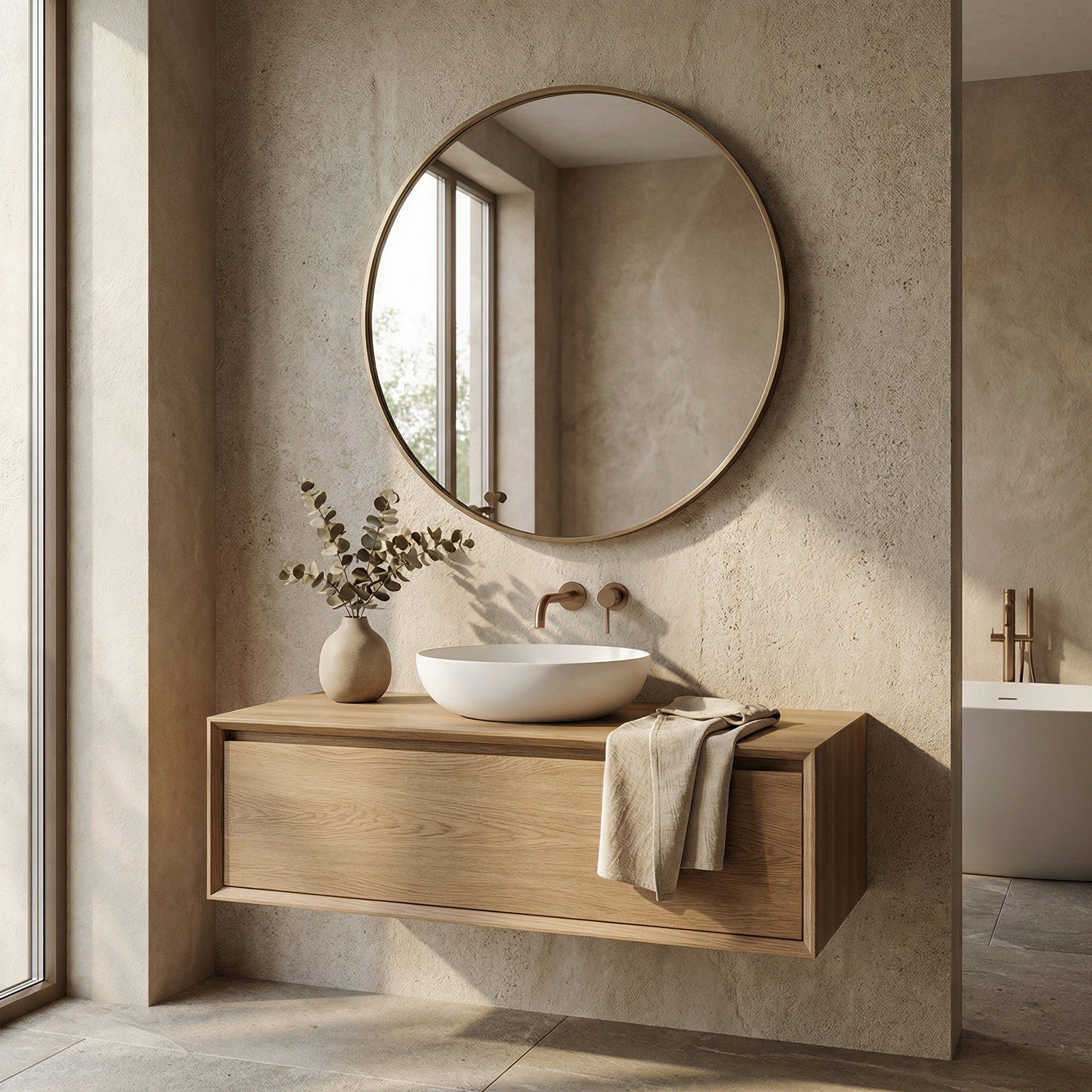 Bronza este o oglindă rotundă cu ramă metalică finisată în ton bronz, concepută pentru a adăuga un accent discret, dar bine definit în spațiu. Forma circulară creează echilibru vizual, iar profilul subțire al ramei menține o estetică curată și coerentă.