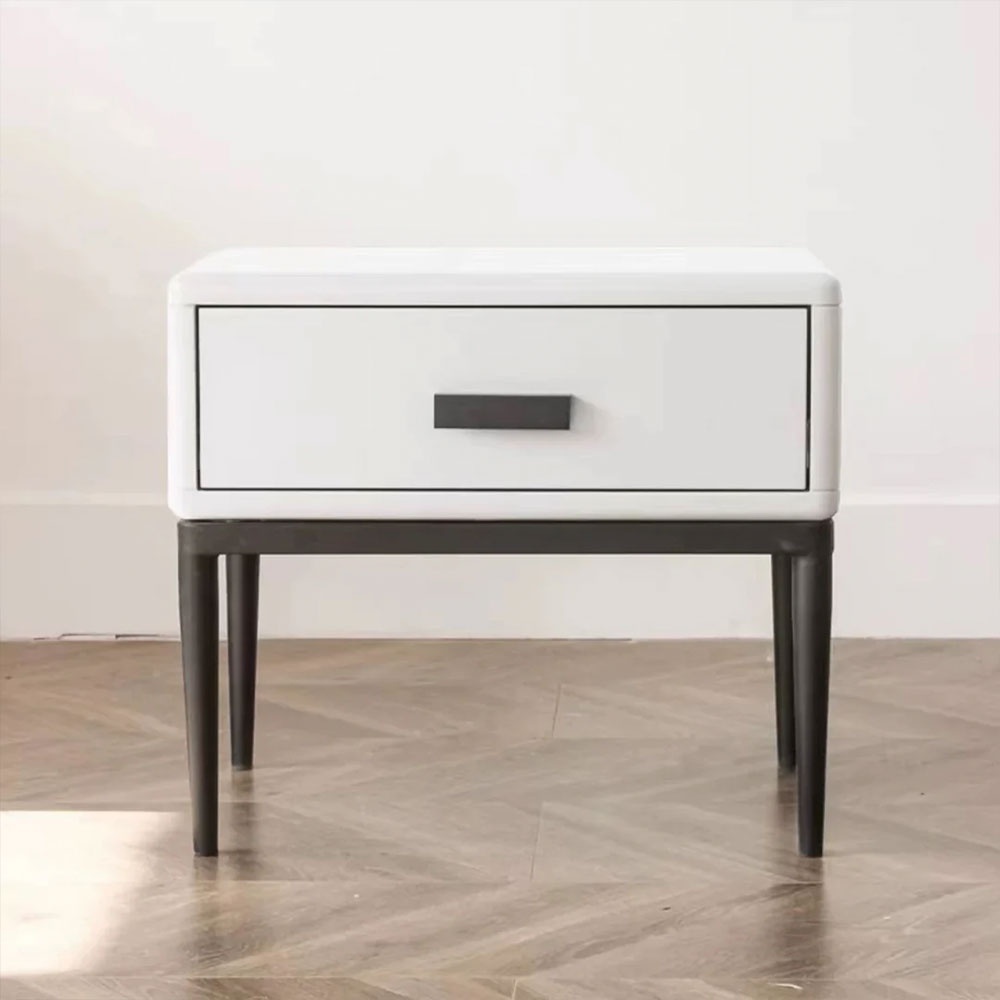 Frontul sertarului, finisat într-o nuanță luminoasă de alb-crem, se completează perfect cu baza și picioarele din oțel carbon vopsit în negru mat, creând un contrast sofisticat.