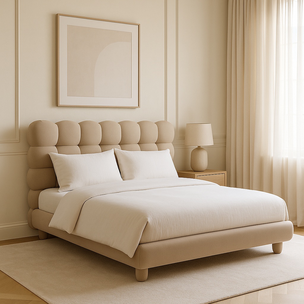 Patul Mira Premium este o reinterpretare modernă a confortului, unde estetica sculpturală se îmbină perfect cu funcționalitatea. Tăblia sa înaltă, capitonată în catifea bej fină, creează un efect vizual tridimensional, oferind în același timp o susținere moale și plăcută. Forma sa rotunjită și proporțiile echilibrate conferă un aer fluid și cald, ideal pentru dormitoare moderne sau interioare cu influențe modern luxury și minimal organic.