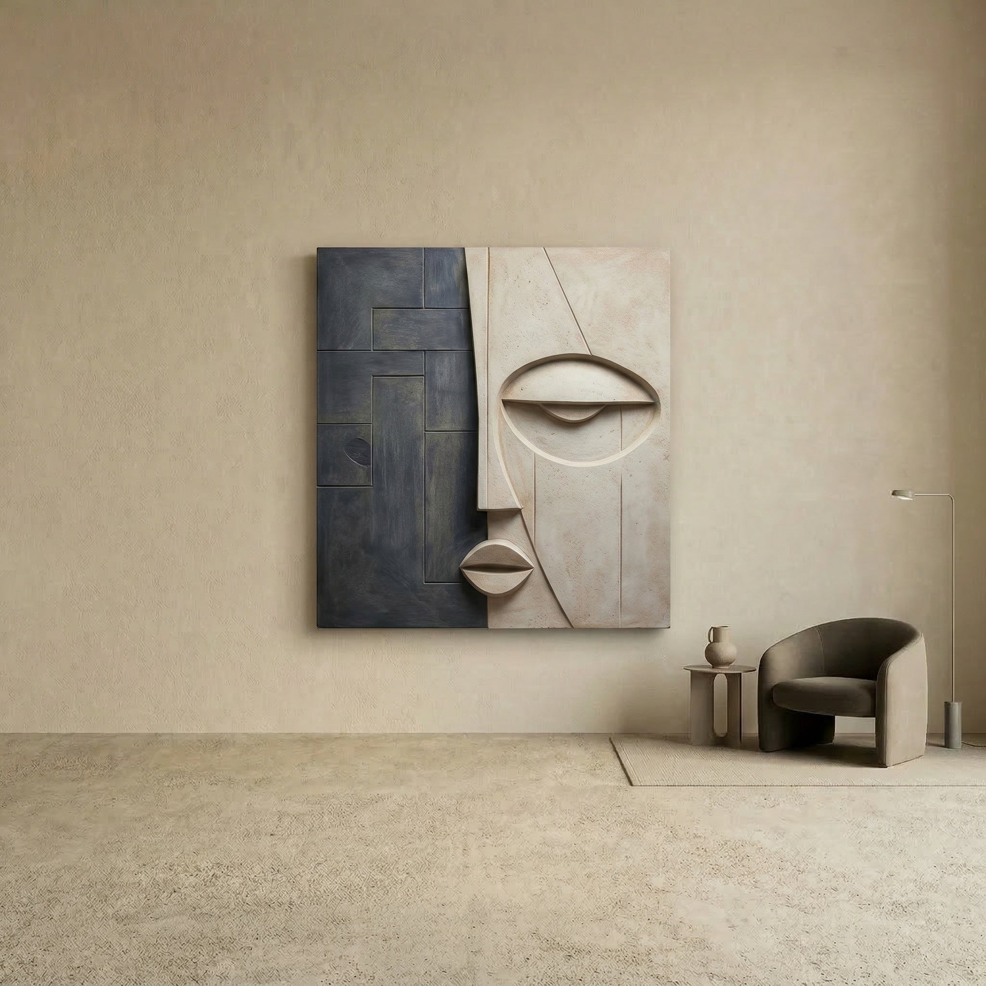 Tabloul Stillness exprimă echilibrul și liniștea printr-o compoziție abstractă cu forme geometrice și accente subtile inspirate din trăsături umane. Designul combină suprafețe plane cu elemente reliefate, creând un joc discret de volum și textură.